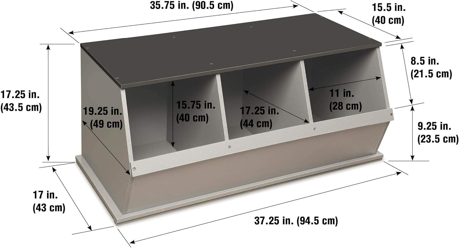 Product Description Badger Basket's Three Bin Stackable Storage Cubby/Bin is a sturdy, modular storage solution for keeping all sorts of items tidy in any room. Features three, large, open compartments and it can be stacked with other bins to expand your storage capacity (each unit sold separately). Use for storing books, papers, media, dolls, toys, sporting goods, games, craft supplies, linens, and more! Wide mouth openings make it easy to load and unload. When you need to clean up quickly, it is a breeze to stuff everything inside! Great for kids when learning to sort and organize. Top surface offers an additional place to keep collections and trophies. Easy to clean, solid panel, smooth surface construction. Made of engineered wood with melamine lamination. Badger Basket's Three-Bin units can mix and match with Badger's Two-Bin and Shelf Storage units. Overall unit measures approximately 37.25 inches L x 19.25 inches W x 17.25 inches H. Each bin measures 11 inches L x 17.25 inches W x 15.75 inches H. Height from floor to top edge of front panel is 9.25 inches. Assembled weight: 33.5 pounds. All measurements approximate. Wipe clean and dry thoroughly. Adult assembly required. When stacking multiple bins, you must always use the included safety brackets to secure the units together. If stacking three or more bins high, we recommend using wall anchor/furniture safety straps (not included) to anchor the units to the wall for safety. Wall anchor straps are not included due to the many types of walls found in homes. Please consult with your local hardware retailer. Product may vary slightly from shown. Props/accessories shown are for illustration purposes only. Product complies with all currently applicable safety standards. Actual color/finish may vary from screen display. This item ships in its original carton that may include a product photo. Soft plastic/rubber toys (such as balls) can react with the finish when left in prolonged contact. Be mindful of what is stored in the unit. From the Manufacturer Badger Basket's Three Bin Stackable Storage Cubby/Bin is a sturdy, modular storage unit for organizing toys, crafts, and more. Even the littlest kids can put stuff away. Coordinates and stacks with Badger Basket Two Bin and Shelf Bin units. Wipe clean.