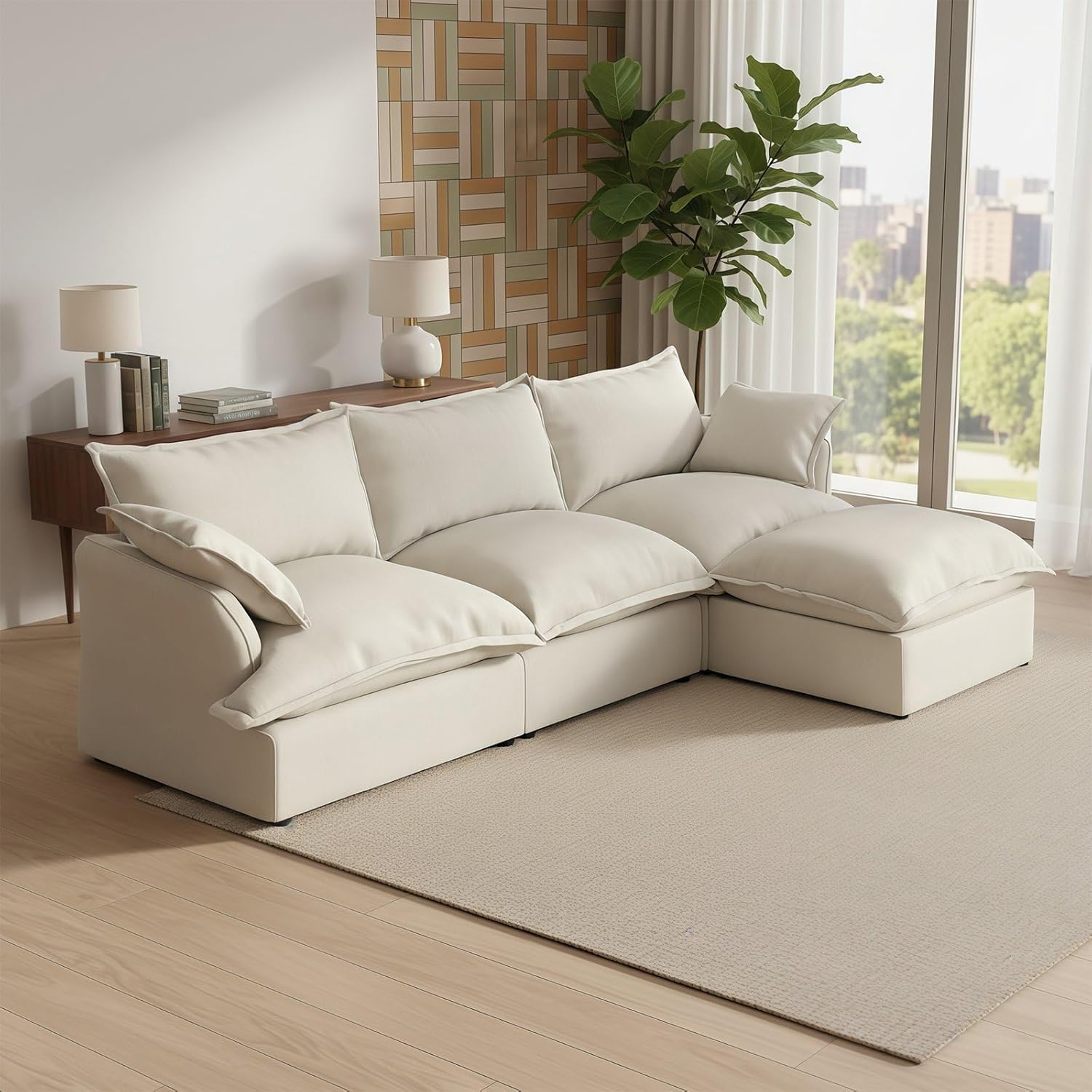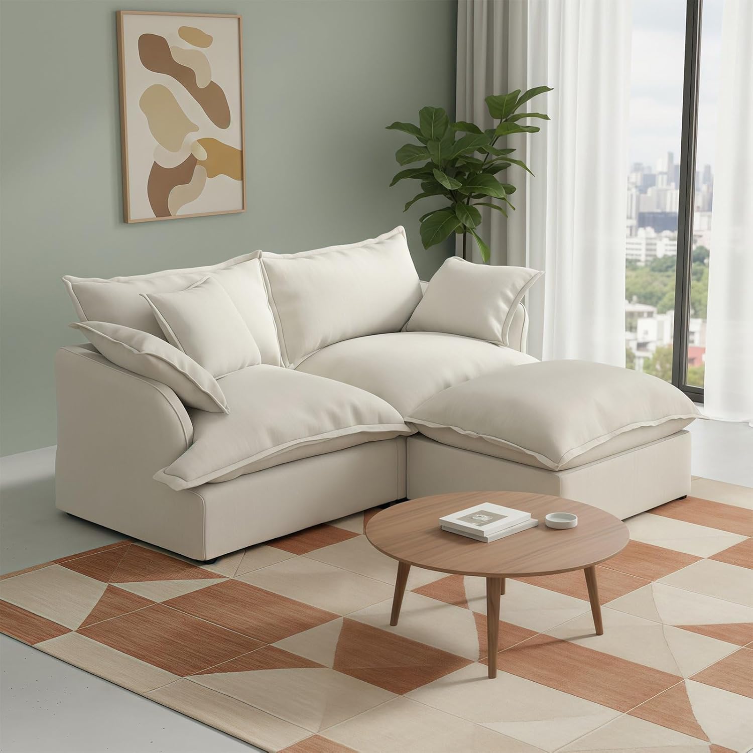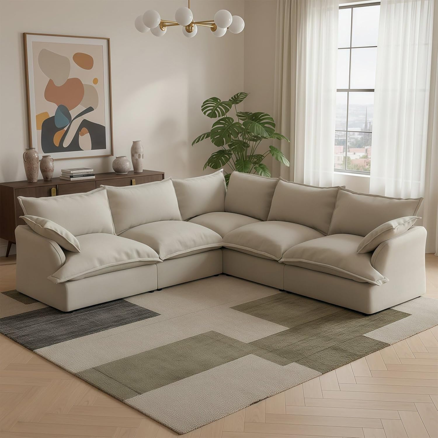 Forest aesthetics Cloud Couch Sectional for Living Room---Comfy Down Filled Cloud Modular Sectional SofaMaterial:Linen Blend-breathable, skin-friendly, wear-resistant, wrinkle resistant, and resistant to pilling.Sofa filling:Down-filled Armrest, seat bag, backrest cushions,fiber filling foam.Ergonomic Curved: Cradle your body's natural posture for ultimate relaxation. Delivering optimal lumbar and arm support.Colour: cream white, grey, green, khakiDetachable Washable: Detachable Couch Cushion CoversApplicable occasions: Living room, bedroom, lounge, apartmentMultiple packages: Orders are sent out in multiple packages,which may be delivered at different times. Sink into the ultimate comfort of a sofa that feels like sitting on a cloud.Meet your new living room centerpiece.The Cloud Modular Sectional combines versatile stylewith personalized comfort.