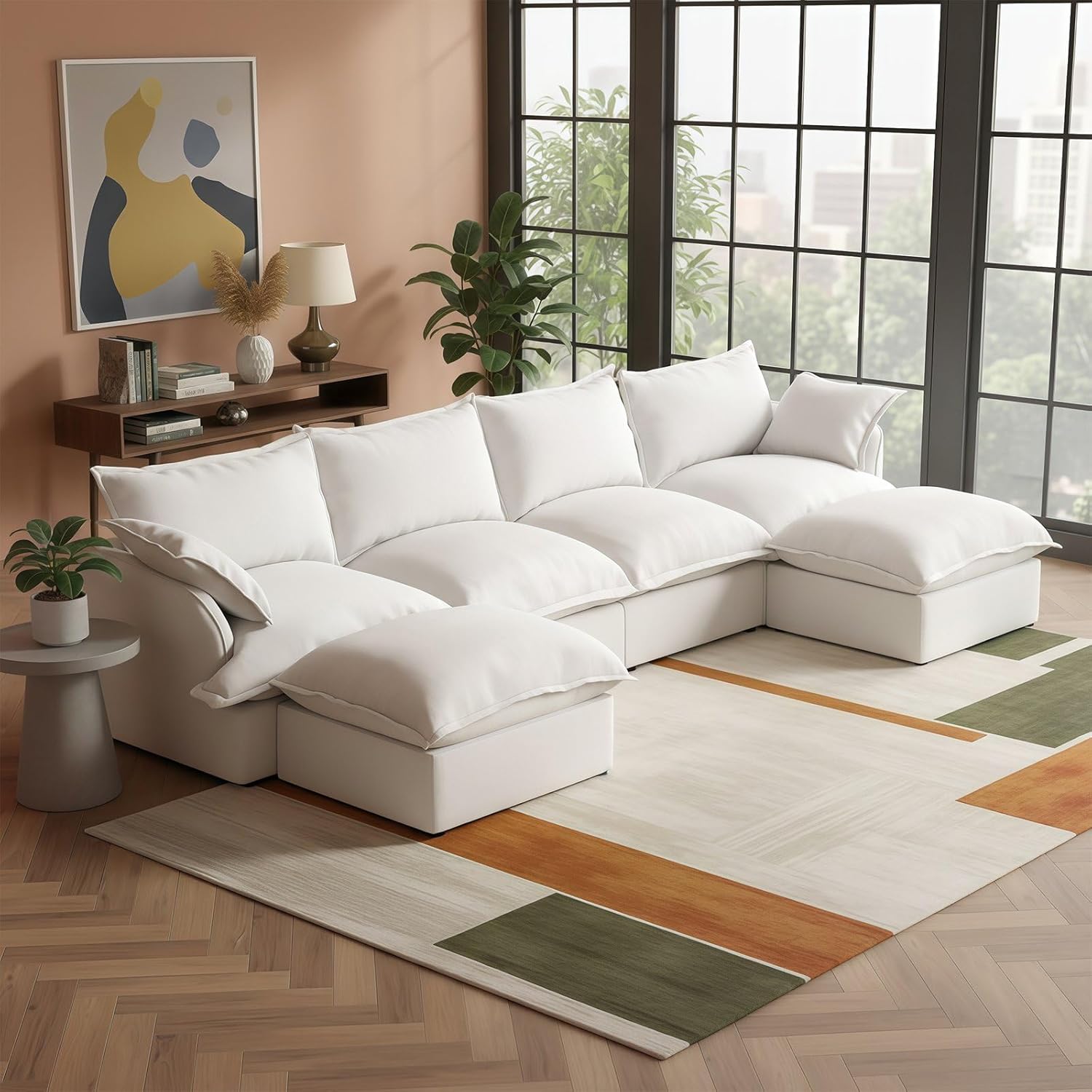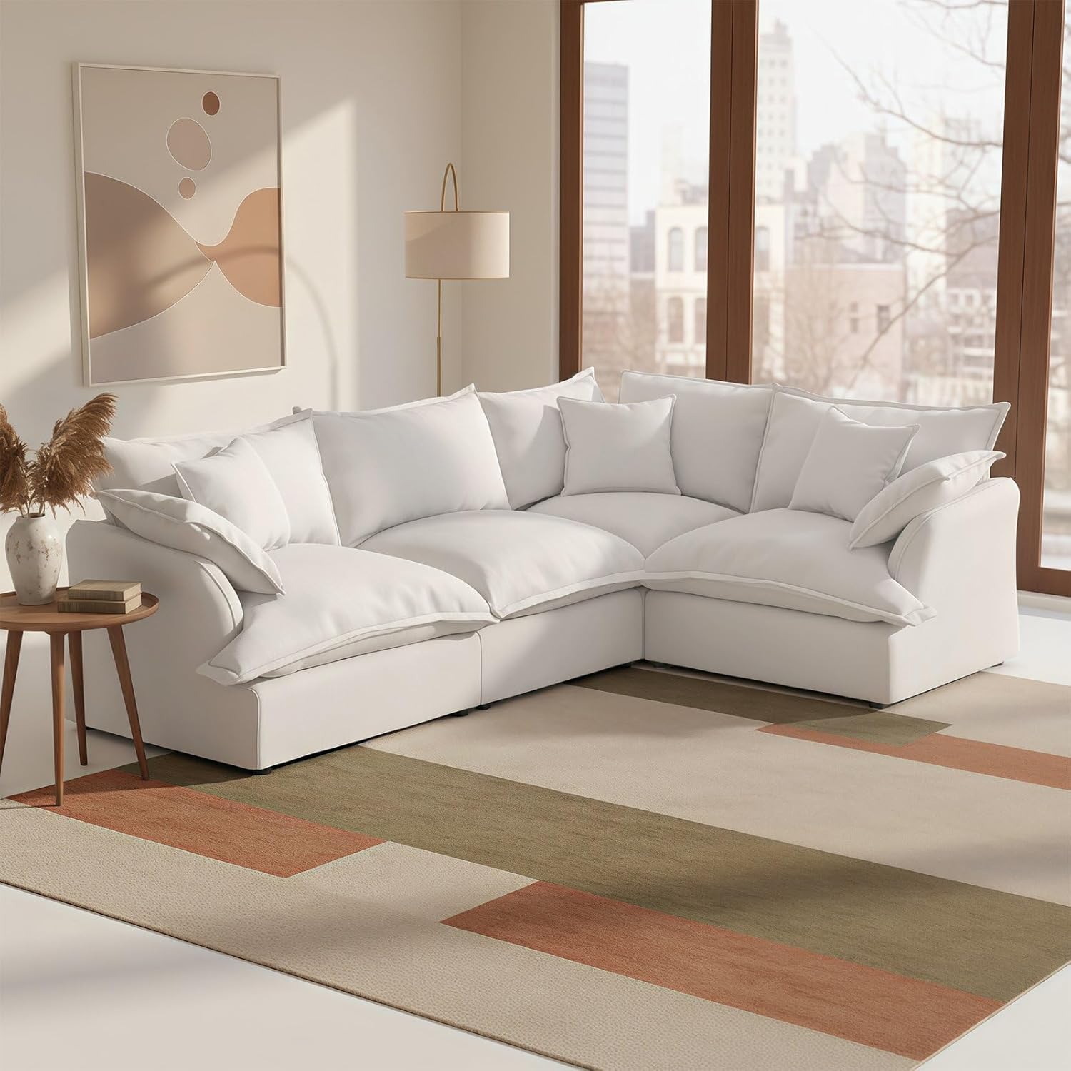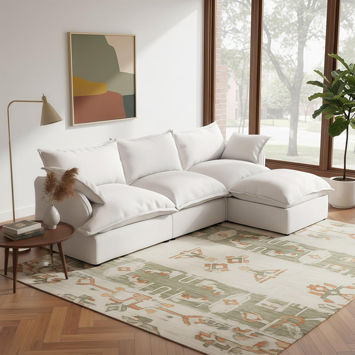 Forest aesthetics Cloud Couch Sectional for Living Room---Comfy Down Filled Cloud Modular Sectional SofaMaterial:Linen Blend-breathable, skin-friendly, wear-resistant, wrinkle resistant, and resistant to pilling.Sofa filling:Down-filled Armrest, seat bag, backrest cushions,fiber filling foam.Ergonomic Curved: Cradle your body's natural posture for ultimate relaxation. Delivering optimal lumbar and arm support.Colour: cream white, grey, green, khakiDetachable Washable: Detachable Couch Cushion CoversApplicable occasions: Living room, bedroom, lounge, apartmentMultiple packages: Orders are sent out in multiple packages,which may be delivered at different times. Sink into the ultimate comfort of a sofa that feels like sitting on a cloud.Meet your new living room centerpiece.The Cloud Modular Sectional combines versatile stylewith personalized comfort.