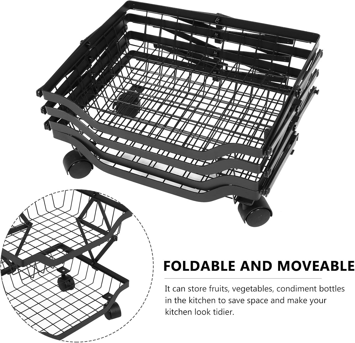 Package Include 1 Rack Characteristics -Product Info:Folding storage rack - Size: 75.00X36.00X28.00cm/29.48X14.15X11.00in -Material: Carbon Steel -Suitable for long-term use, hard materials, provide the best bearing capacity. -The four-layer design can accommodate lots of things orderly. Such as fruits, tableware, vegetables and other items Four-layer Rack. -Elaborate carbon steel materials are of and durability. -Large capacity, which can accommodate many kitchen sundries and other items Kitchen Food Shelf. -It won't take up much space in your house, just taking advantage of the corner space Moveable Food Rack.Goods DescriptionFolding Rack And it also can be used in the bathroom.Multi-layer can be used in the kitchen to place the seasoning, bowl, and plates.Storage Rack with Pulleys It is a multi-layer and multi-functional storage rack.Kitchen Storage is convenient to move anywhere with its wheels.Foldable Kitchen Rack Do you want to make your kitchen and bathroom neat and clean? Maybe you need this one