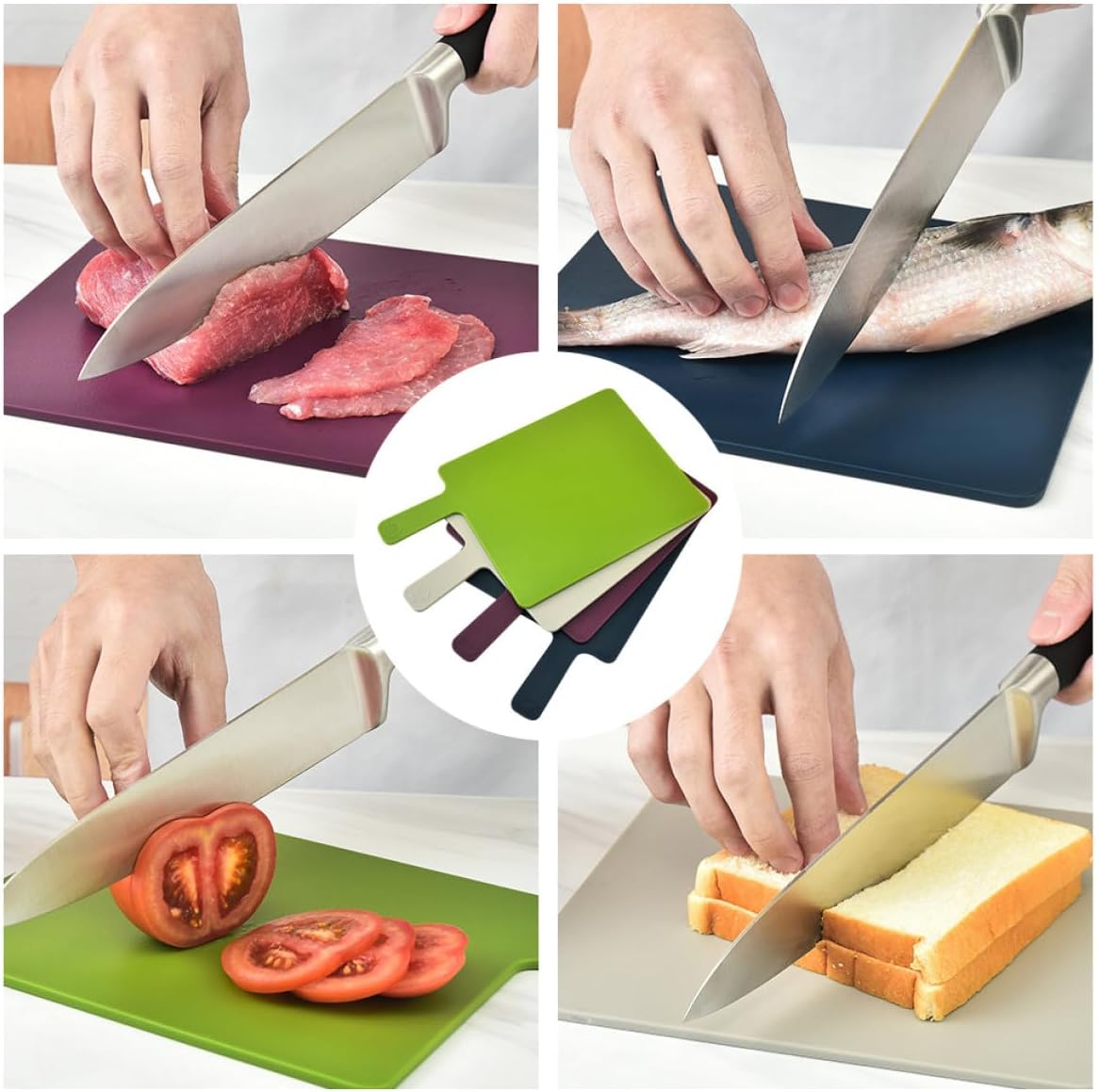 Package List 4 x Cutting Boards 1 x Storage Box Characteristics -Color:Assorted Color -Size: About 32.00X19.70X0.50cm/12.58X7.74X0.20inch (Cutting Board) -Material: PP -Product Info:Classified chopping board -Size: About 24.00X16.80X7.70cm/9.45X6.61X3.03inch (Storage Box) -Adoption of , sturdy and for long-term use. -Great choice for preparing or serving fruit, vegetables, meat or bread curring board. -A perfect housewarming gift for your friends, showing your love and care kitchen gadets. -With fine workmanship, not easy to wear and tear, very practical in use kitchen busy board. -Wide range of uses, can be applied to family kitchens, restaurants, hotels, butcher shops and other places kitchen board.Goods Informationkitchen accesories Simple and practical, sturdy and , with multiple functions, these are what our cutting board can provide you.meat board It has a variety of functions, allowing you to show off your cooking skills.curring board This cutting board is made of PP material and has a large to meet your daily needs
