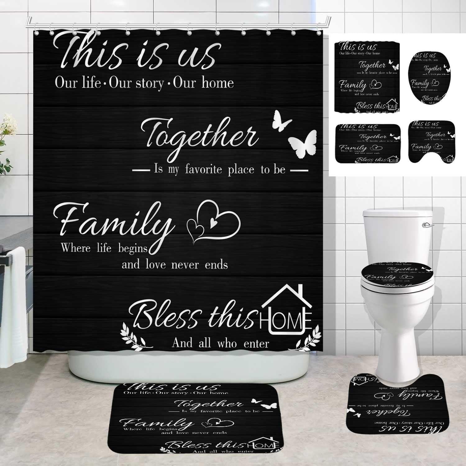 4PCS/Set Family Rules Black Shower Curtain, White Letters Inspirational Quotes Teaching Educational Bathroom Decor for Kids, Waterproof Fabric Bath Curtain, Non-slip Bath Rug Mat, Family Rules