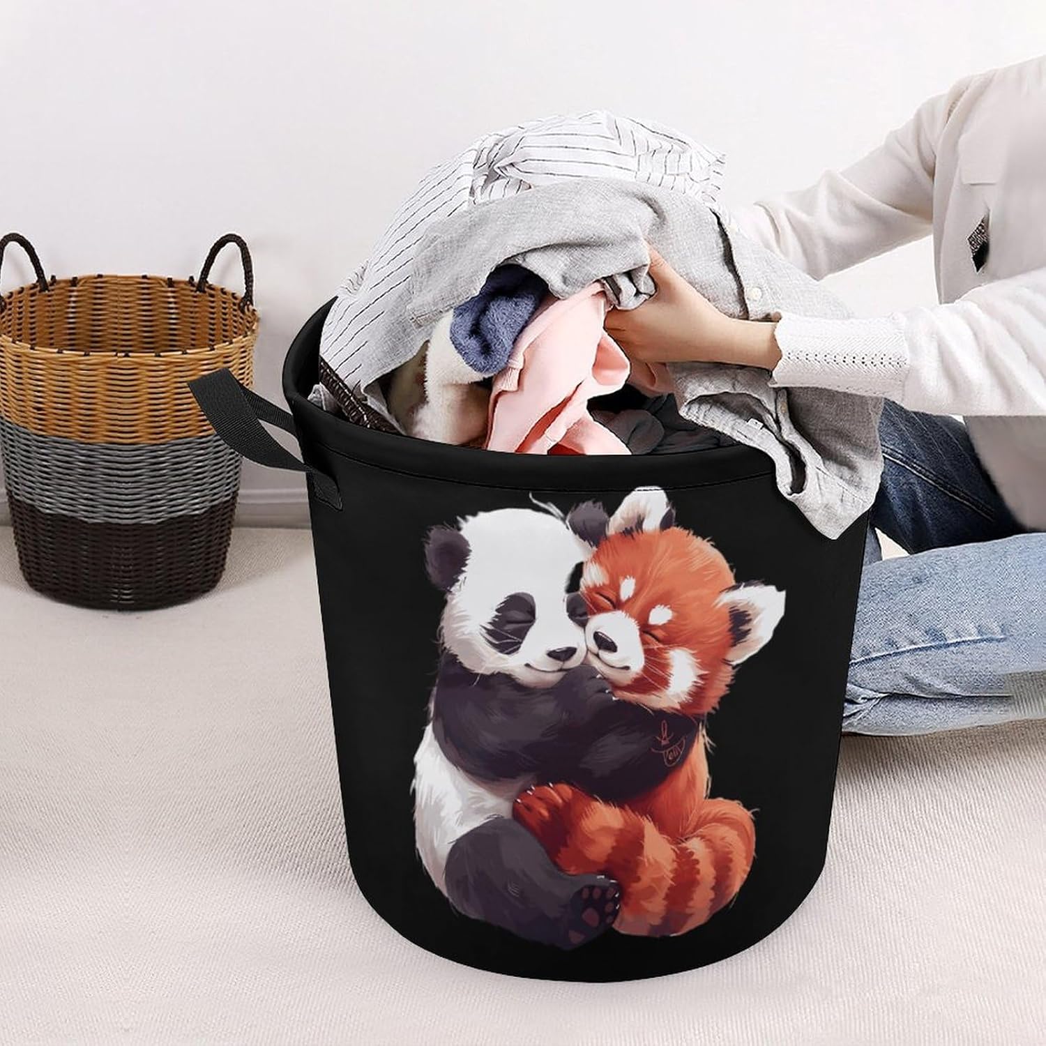 The round laundry basket is made of Oxford cloth, waterproof, and the foldable laundry basket has an extended handle for easy carrying. It is suitable for storing clothes or sundries in dormitories and homes.