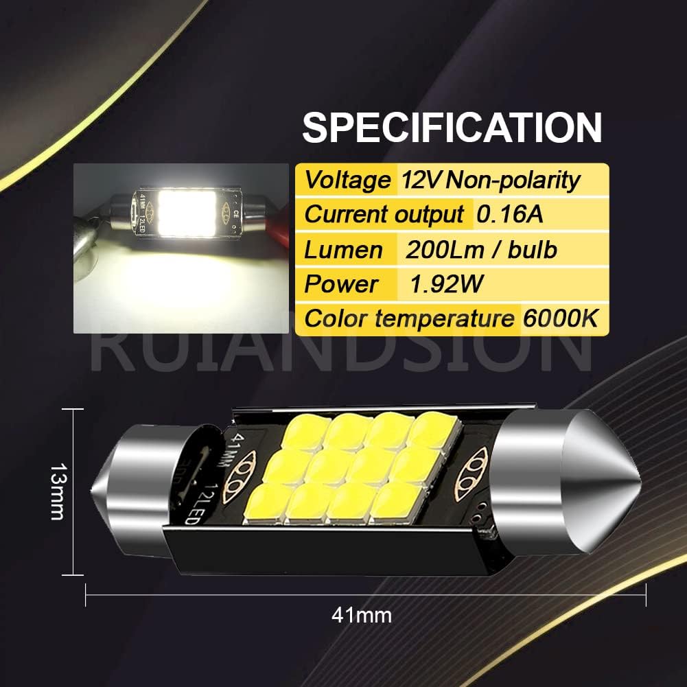 Features:Long-lasting life durability and utility.Low working temperature better heat dissipation.Non-Polarity Design. Plug & Play no polarity sensitive. Specifications:Model: 31mm LED BulbsColor: White Voltage: DC 12VLumen:200lmPower: about 19.2WChips Type: 3030LED quantity: 9 Pcs (each lamp)Service Life: 50 000 Hrs Working Temperature:-40~75 degreeApplication: Car Interior Lights/Dome/Map Lights etc.Package Content : 2pcs 31mm LED Interior Lights Note: Please confirm the bulb base before placing an order.Easy installation no any modification need just plug &playWarranty: Ruiandsion Warranty for 1 year from date of purchase. Warranty type: Exchange or replacement.